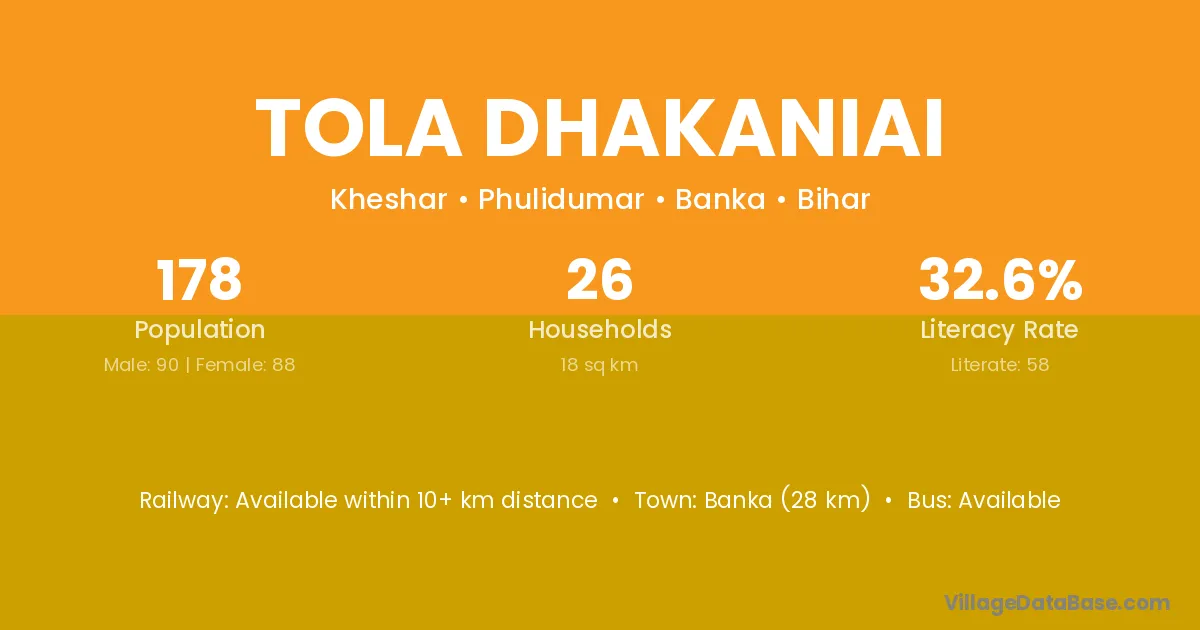 Banka (28 km) is the nearest town to Tola Dhakaniai village for major economic activities and is located approximately 28 km away.