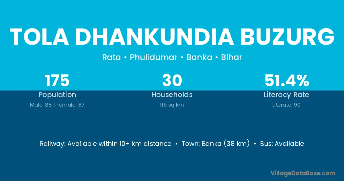 Tola Dhankundia Buzurg village has a total population of 175 people, of which 88 are males and 87 are females.