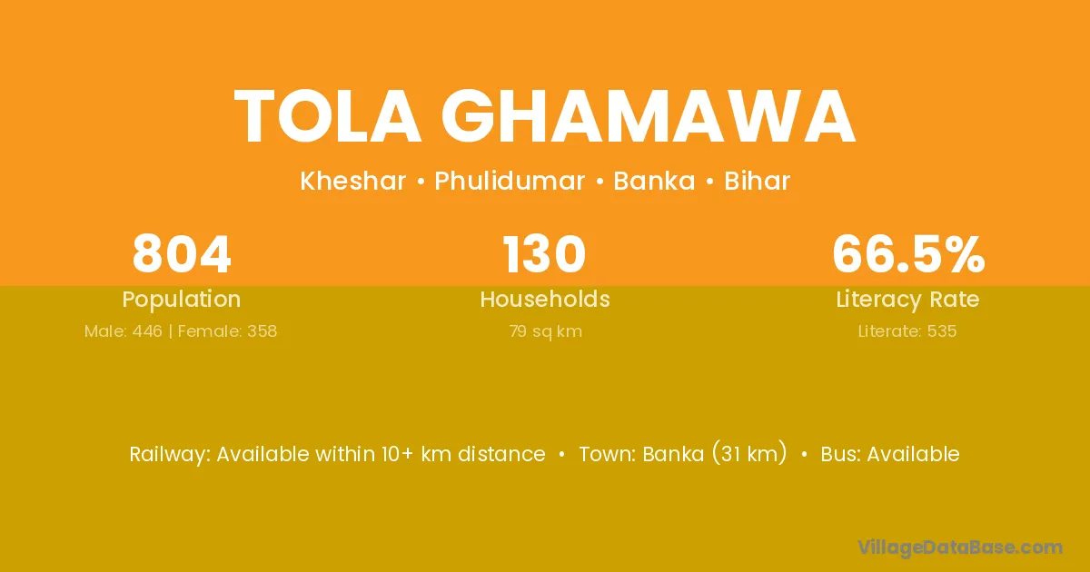 Banka (31 km) is the nearest town to Tola Ghamawa village for major economic activities and is located approximately 31 km away.