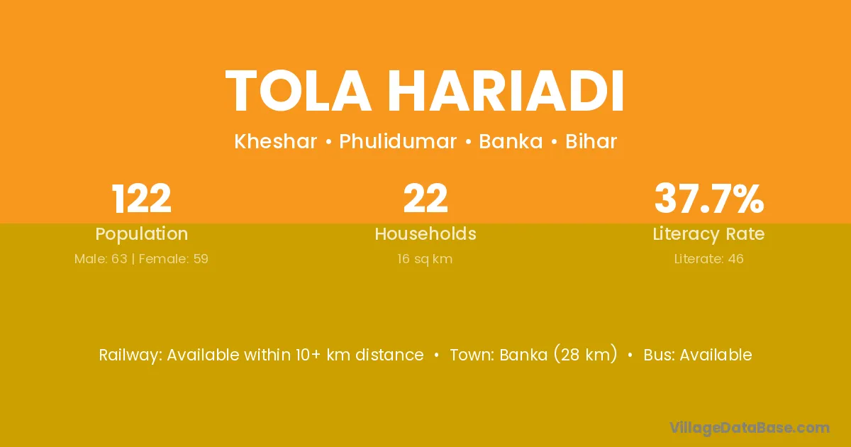 Banka (28 km) is the nearest town to Tola Hariadi village for major economic activities and is located approximately 28 km away.