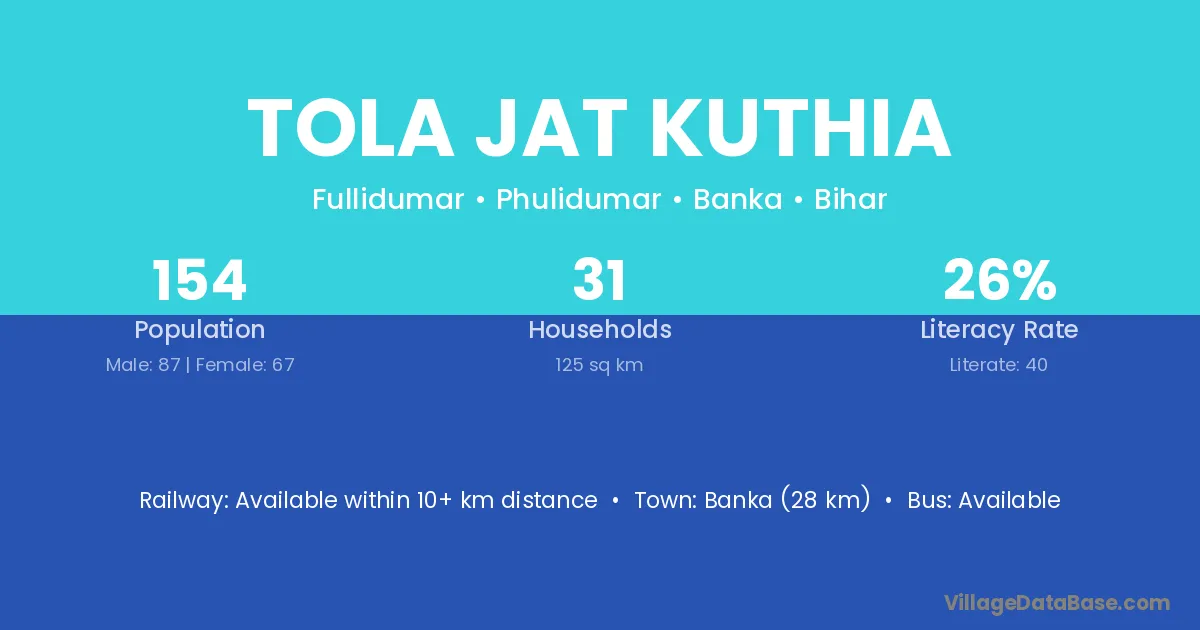 Banka (28 km) is the nearest town to Tola Jat Kuthia village for major economic activities and is located approximately 28 km away.