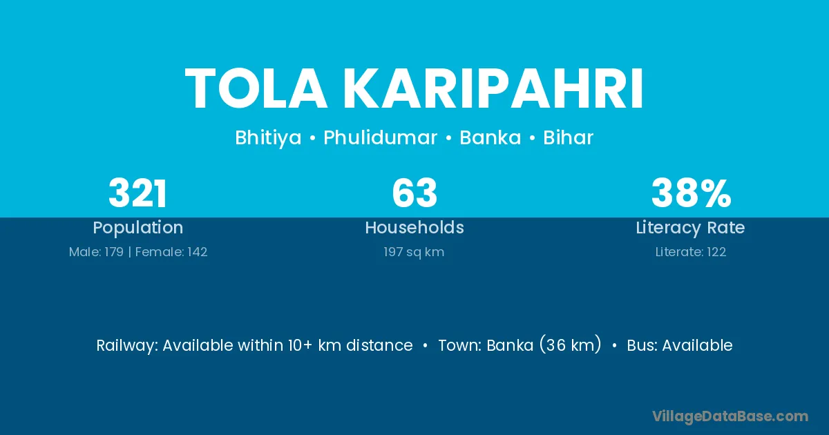 Banka (36 km) is the nearest town to Tola Karipahri village for major economic activities and is located approximately 36 km away.