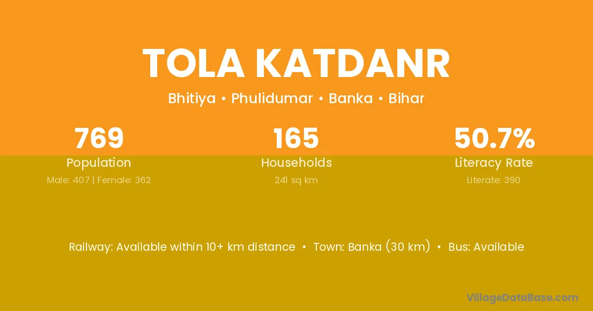 Banka (30 km) is the nearest town to Tola Katdanr village for major economic activities and is located approximately 30 km away.