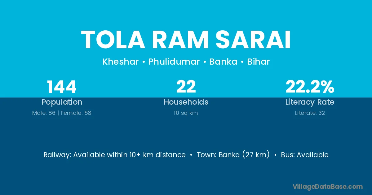 Banka (27 km) is the nearest town to Tola Ram Sarai village for major economic activities and is located approximately 27 km away.