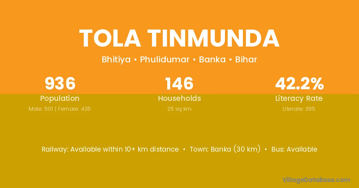 Banka (30 km) is the nearest town to Tola Tinmunda village for major economic activities and is located approximately 30 km away.