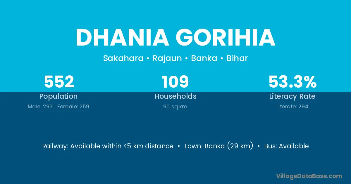 Banka (29 km) is the nearest town to Dhania Gorihia village for major economic activities and is located approximately 29 km away.