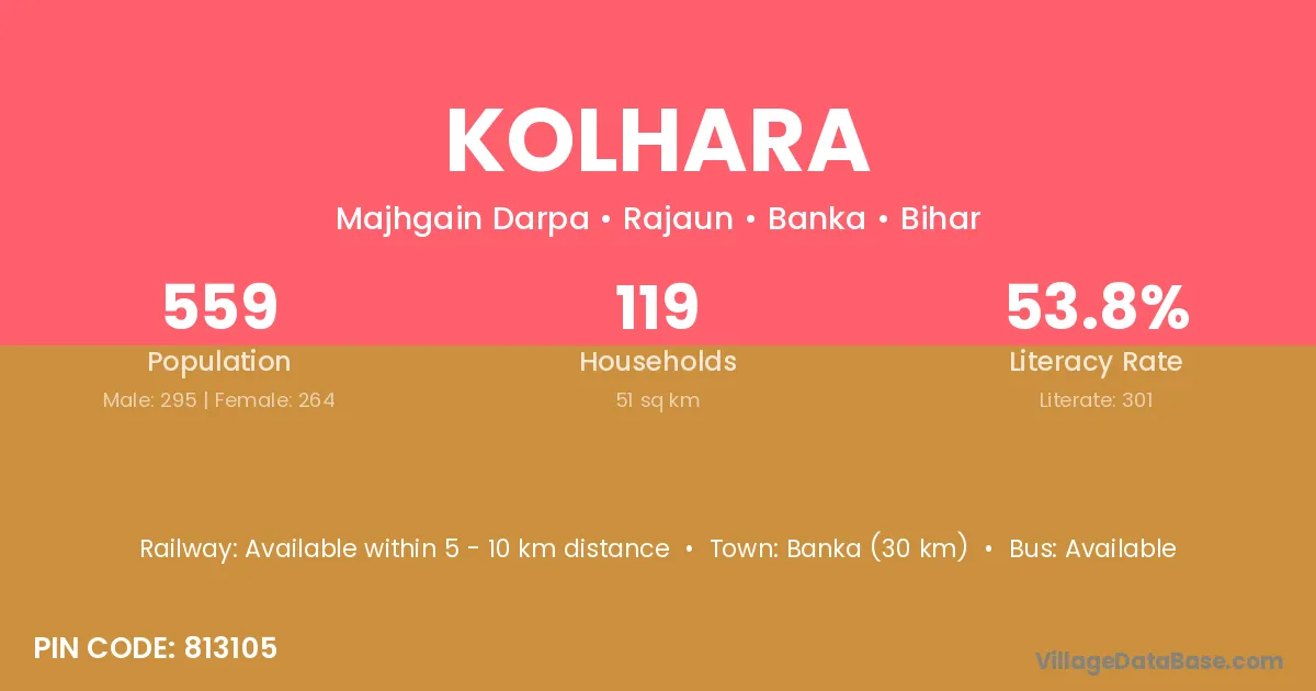 Banka (30 km) is the nearest town to Kolhara village for major economic activities and is located approximately 30 km away.