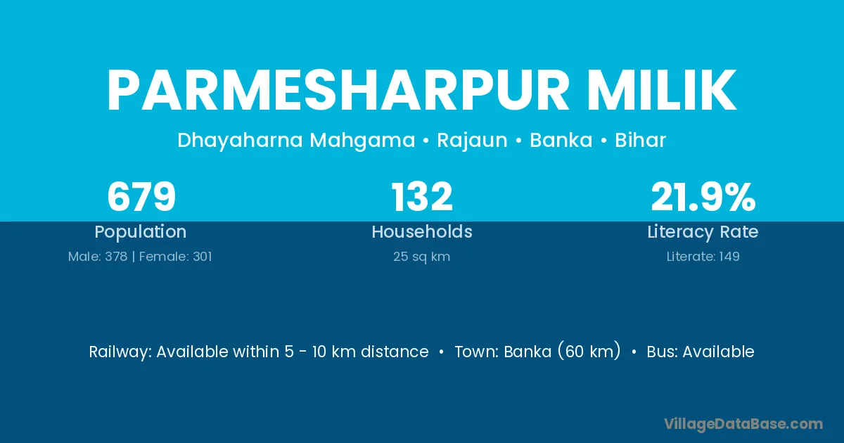 Banka (60 km) is the nearest town to Parmesharpur Milik village for major economic activities and is located approximately 60 km away.