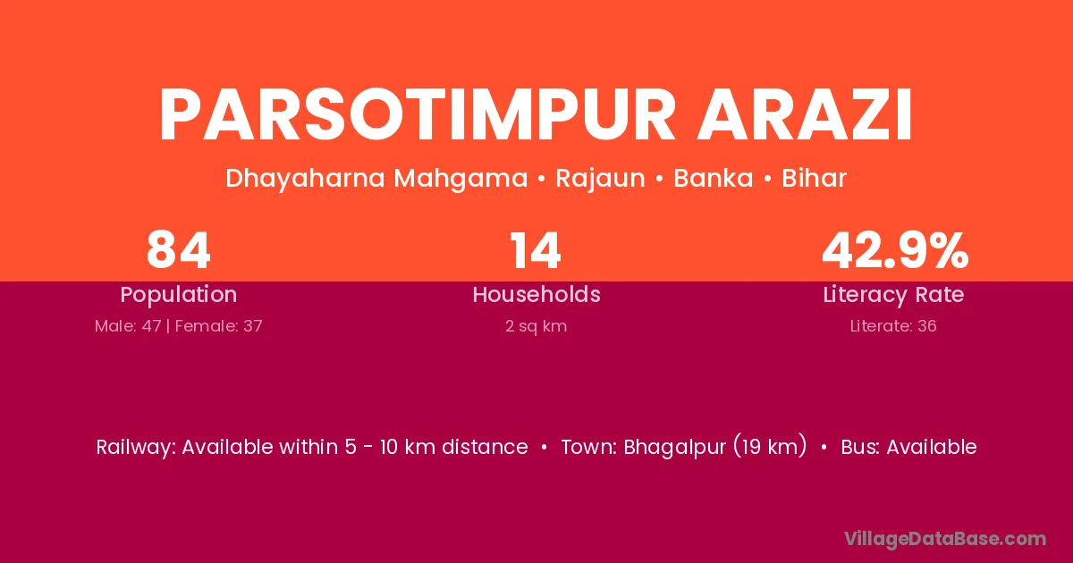 Bhagalpur (19 km) is the nearest town to Parsotimpur Arazi village for major economic activities and is located approximately 19 km away.