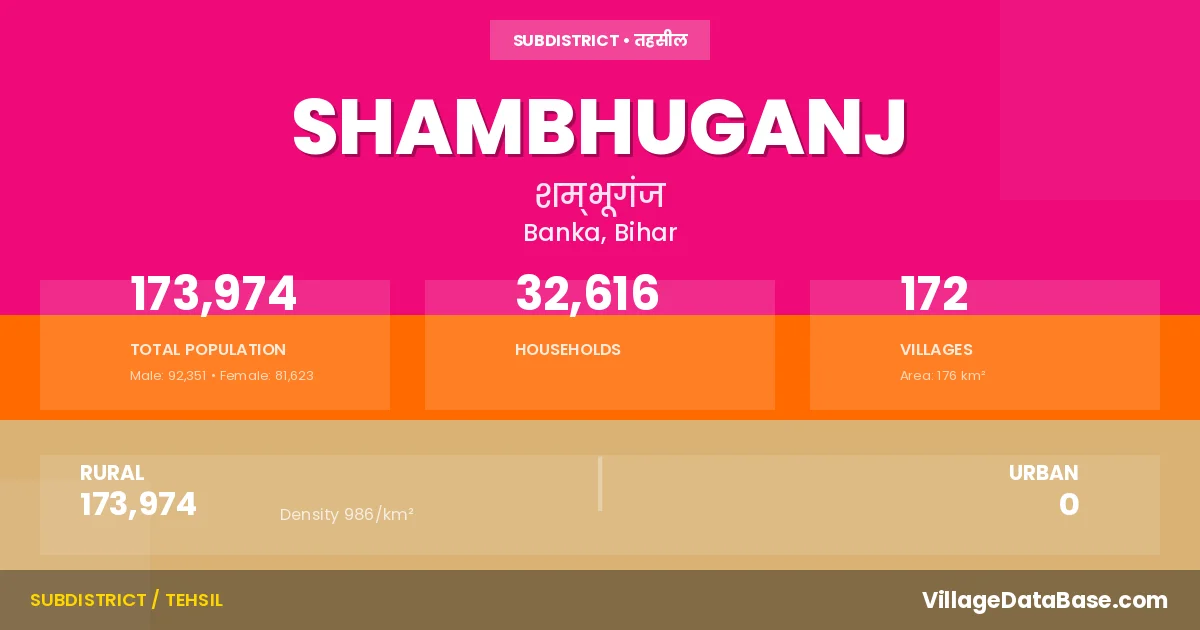 According to the 2011 census The total area of Shambhuganj Subdivision is 176 km², with a population of 173974 people. The population density is 986 inhabitants per square kilometre, and there are approximately 32616 houses in the sub district.