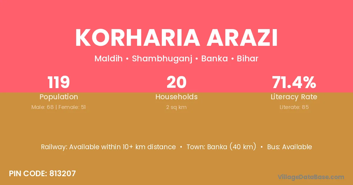 Banka (40 km) is the nearest town to Korharia Arazi village for major economic activities and is located approximately 40 km away.