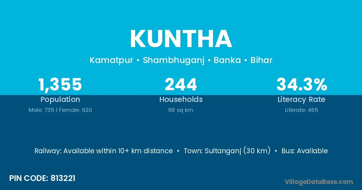 Sultanganj (30 km) is the nearest town to Kuntha village for major economic activities and is located approximately 30 km away.