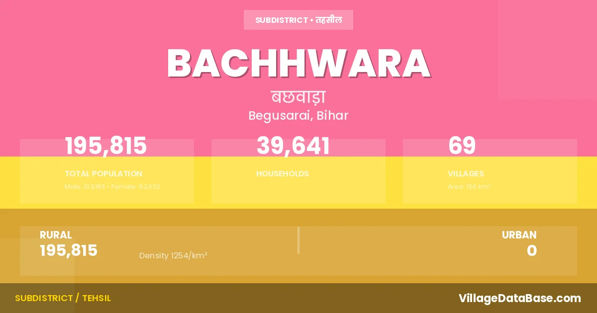 According to the 2011 census The total area of Bachhwara Subdivision is 156 km², with a population of 195815 people. The population density is 1,254 inhabitants per square kilometre, and there are approximately 39641 houses in the sub district.