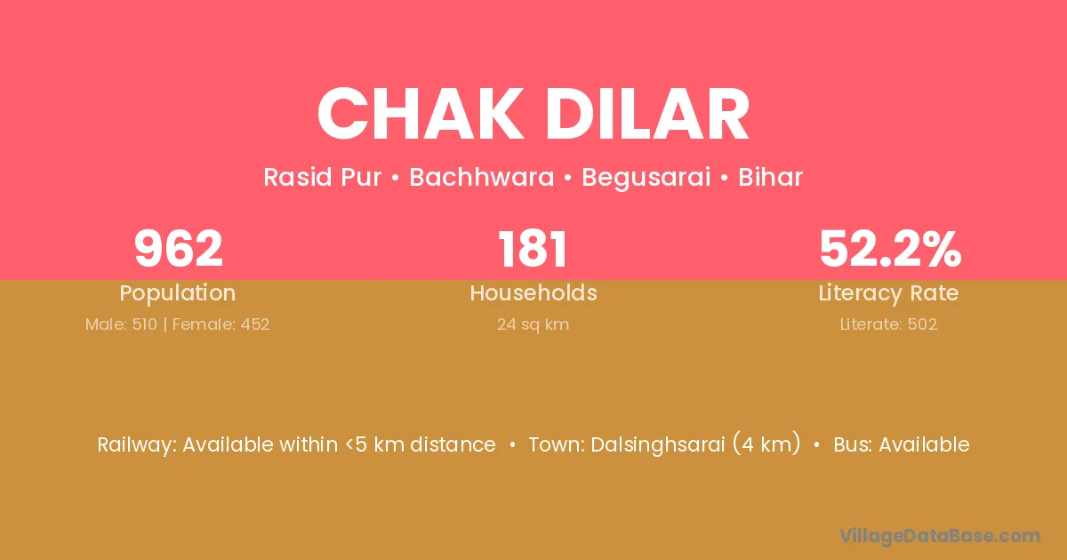 Dalsinghsarai (4 km) is the nearest town to Chak Dilar village for major economic activities and is located approximately 4 km away.
