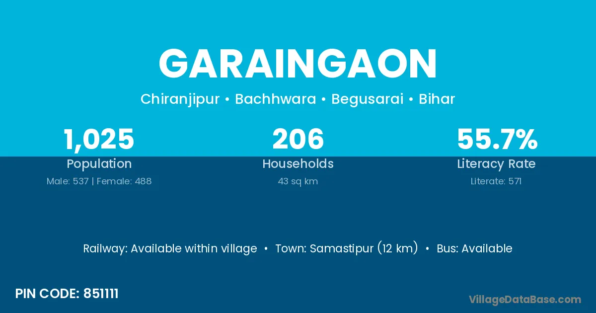 Samastipur (12 km) is the nearest town to Garaingaon village for major economic activities and is located approximately 12 km away.