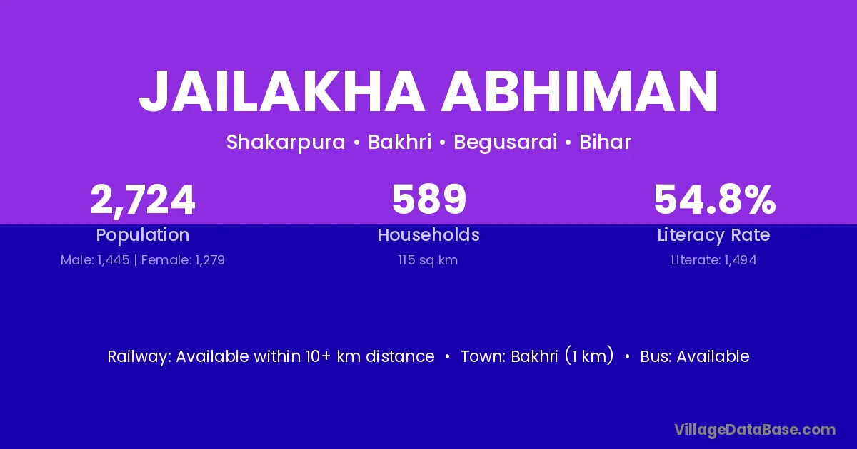 Bakhri (1 km) is the nearest town to Jailakha Abhiman village for major economic activities and is located approximately 1 km away.