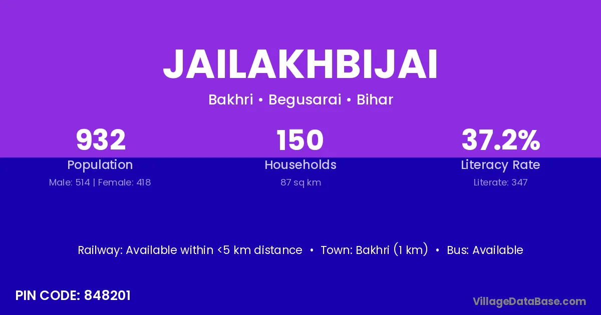 Bakhri (1 km) is the nearest town to Jailakhbijai village for major economic activities and is located approximately 1 km away.