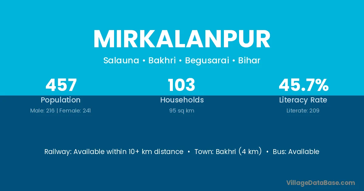 Mirkalanpur village has a total population of 457 people, of which 216 are males and 241 are females.