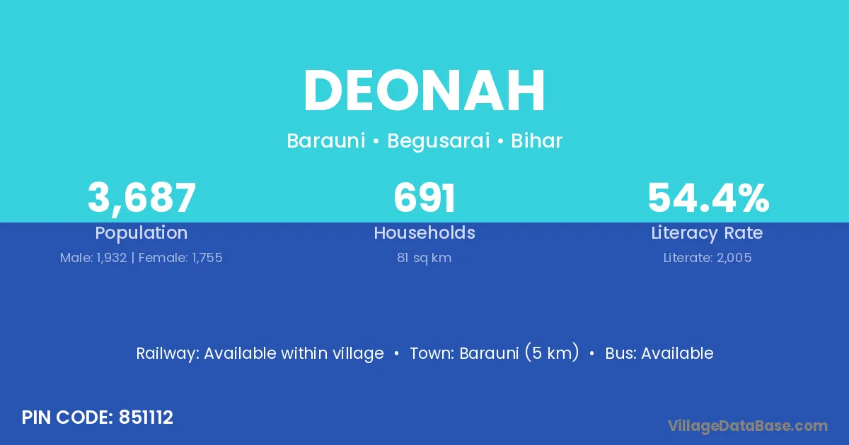 Barauni (5 km) is the nearest town to Deonah village for major economic activities and is located approximately 5 km away.