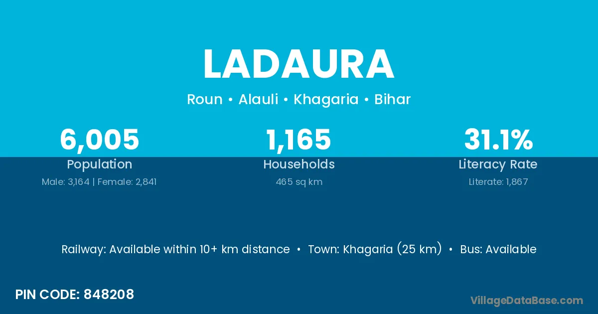 Barauni (6 km) is the nearest town to Ladaura village for major economic activities and is located approximately 6 km away.
