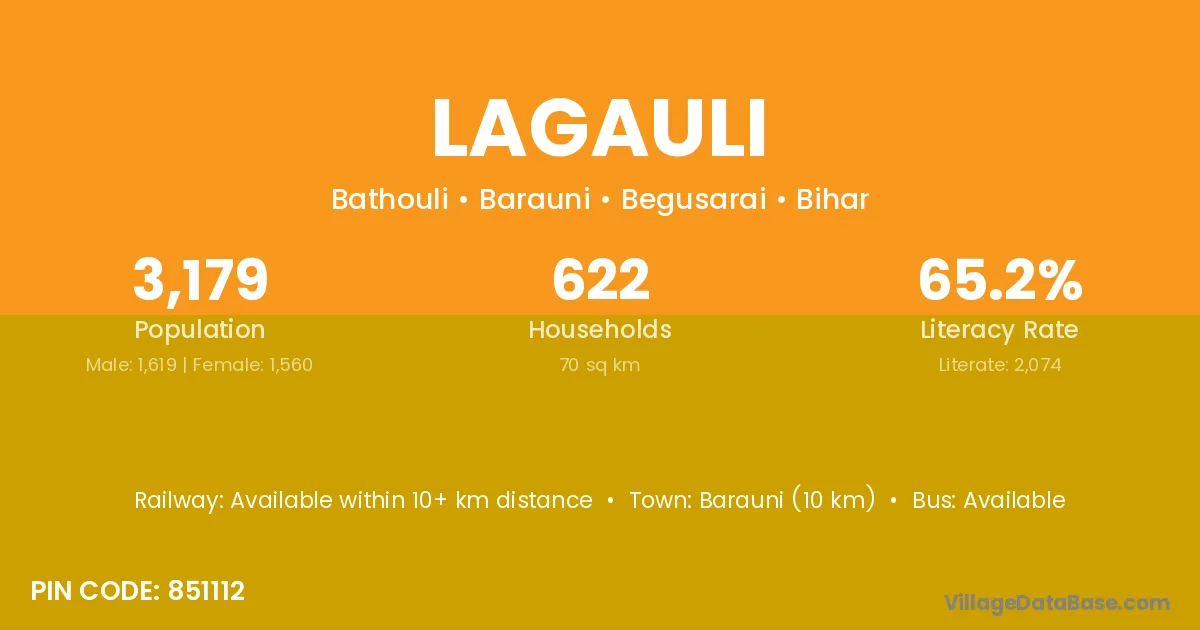 Barauni (10 km) is the nearest town to Lagauli village for major economic activities and is located approximately 10 km away.
