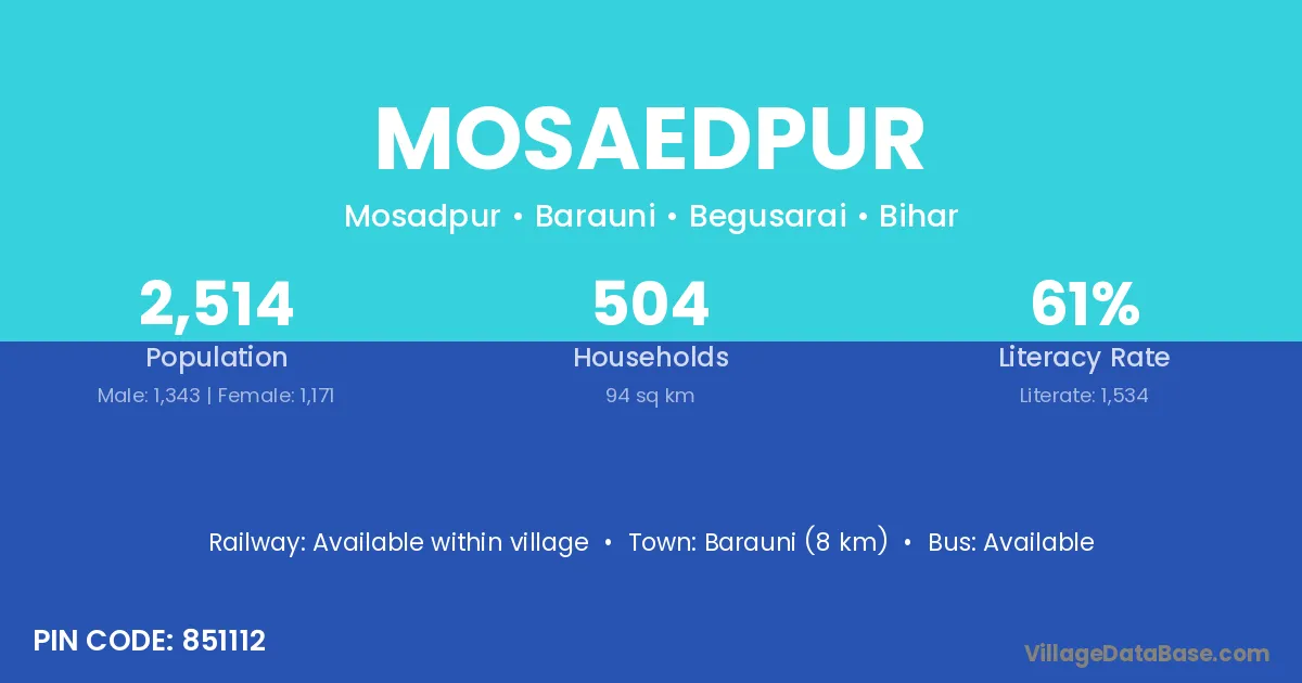 Barauni (8 km) is the nearest town to Mosaedpur village for major economic activities and is located approximately 8 km away.