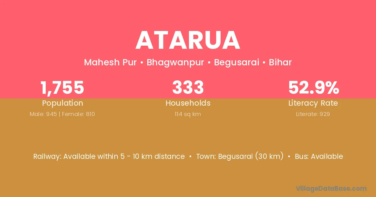 Begusarai (30 km) is the nearest town to Atarua village for major economic activities and is located approximately 30 km away.