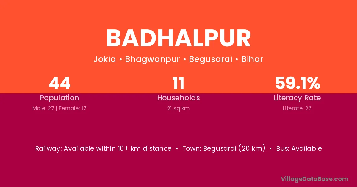 Begusarai (20 km) is the nearest town to Badhalpur village for major economic activities and is located approximately 20 km away.