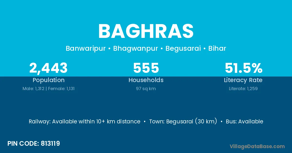 Begusarai (30 km) is the nearest town to Baghras village for major economic activities and is located approximately 30 km away.