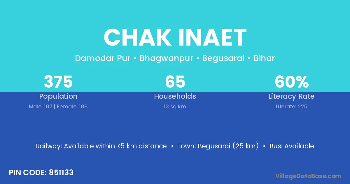 Begusarai (25 km) is the nearest town to Chak Inaet village for major economic activities and is located approximately 25 km away.