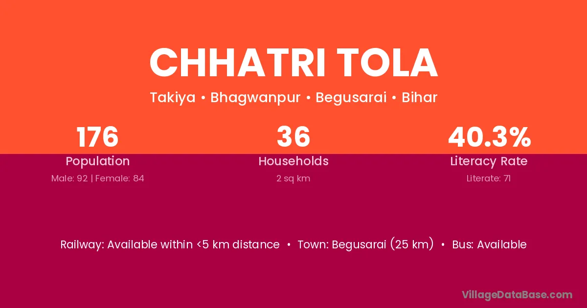 Begusarai (25 km) is the nearest town to Chhatri Tola village for major economic activities and is located approximately 25 km away.