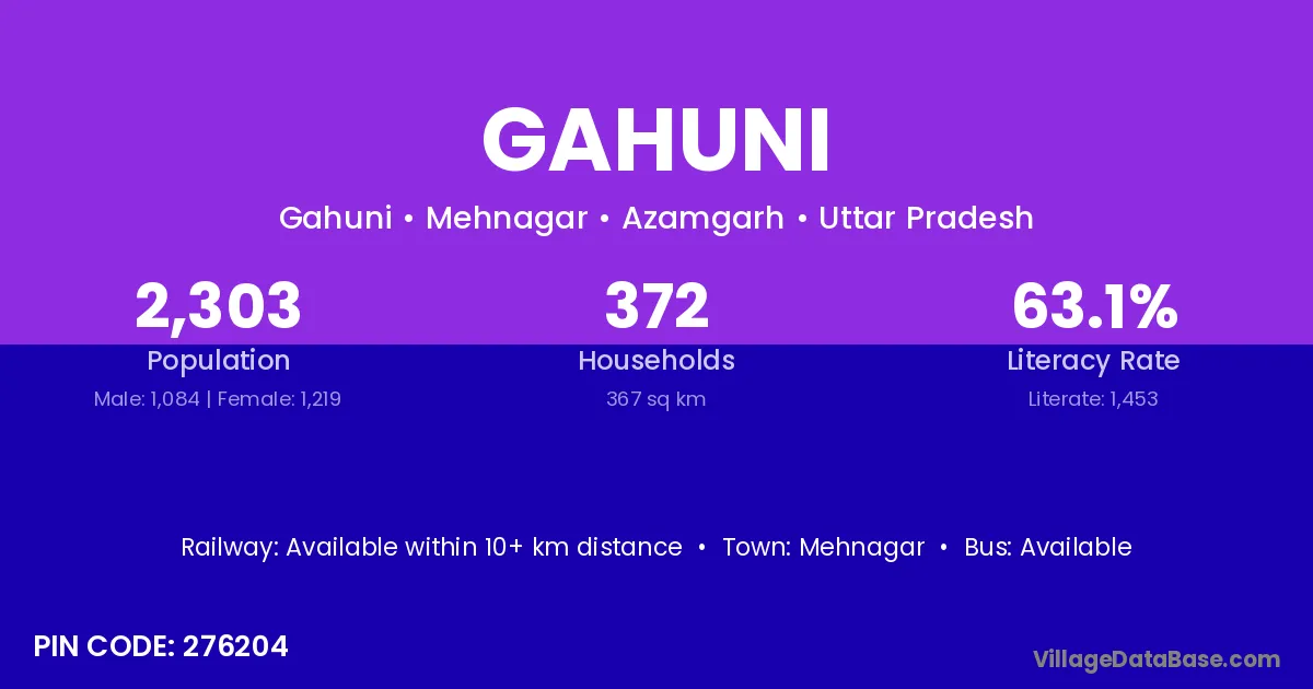 Begusarai (30 km) is the nearest town to Gahuni village for major economic activities and is located approximately 30 km away.