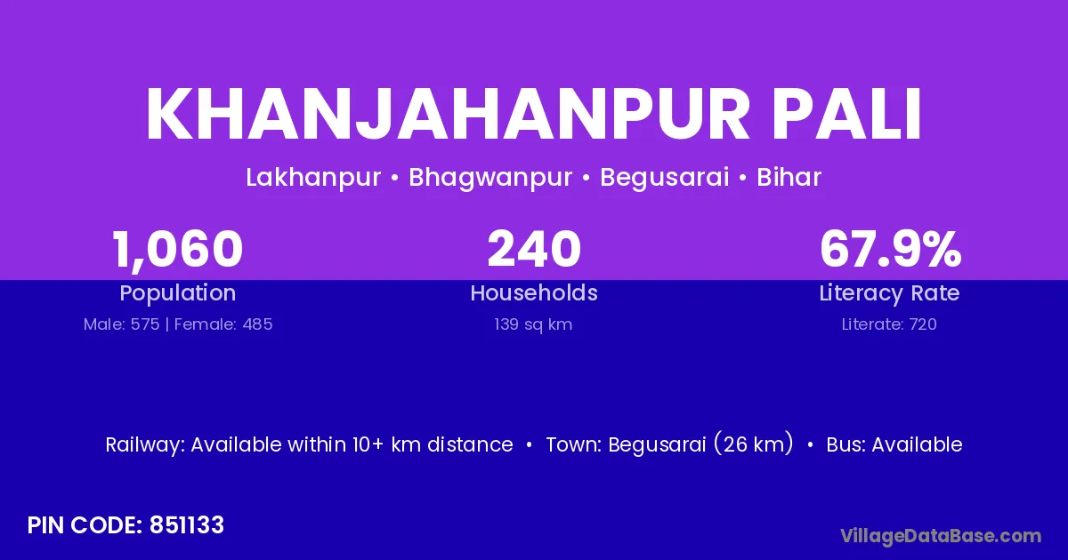 Begusarai (26 km) is the nearest town to Khanjahanpur Pali village for major economic activities and is located approximately 26 km away.