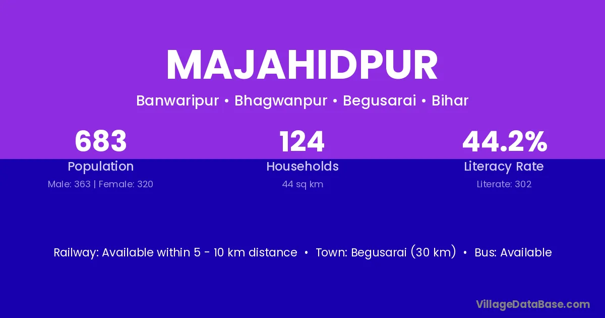 Begusarai (30 km) is the nearest town to Majahidpur village for major economic activities and is located approximately 30 km away.