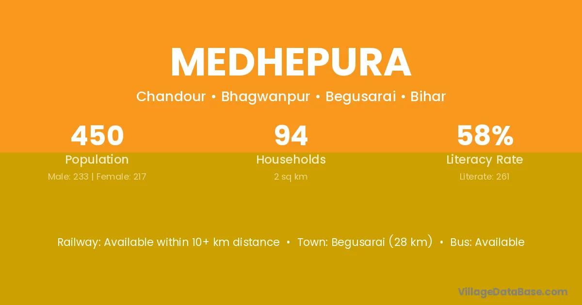 Medhepura village has a total population of 450 people, of which 233 are males and 217 are females.