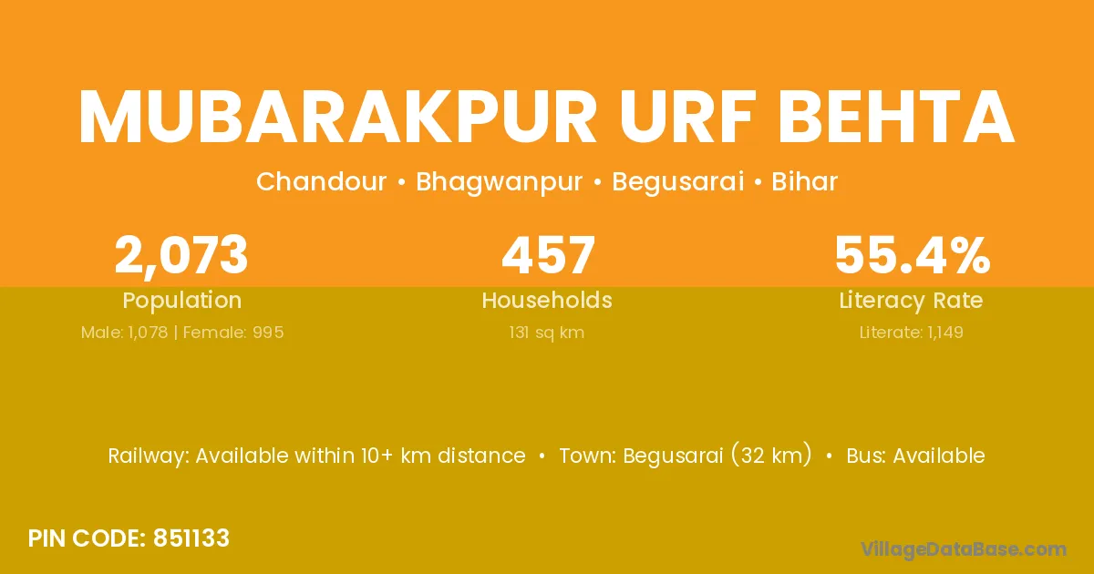 Begusarai (32 km) is the nearest town to Mubarakpur Urf Behta village for major economic activities and is located approximately 32 km away.