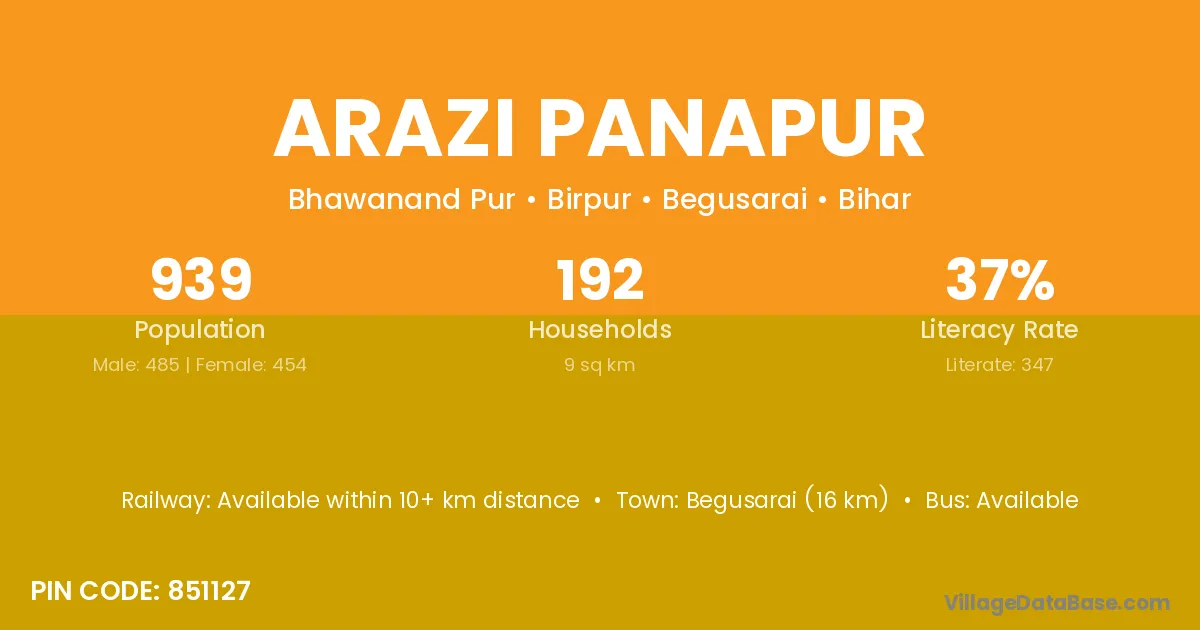 Begusarai (16 km) is the nearest town to Arazi Panapur village for major economic activities and is located approximately 16 km away.