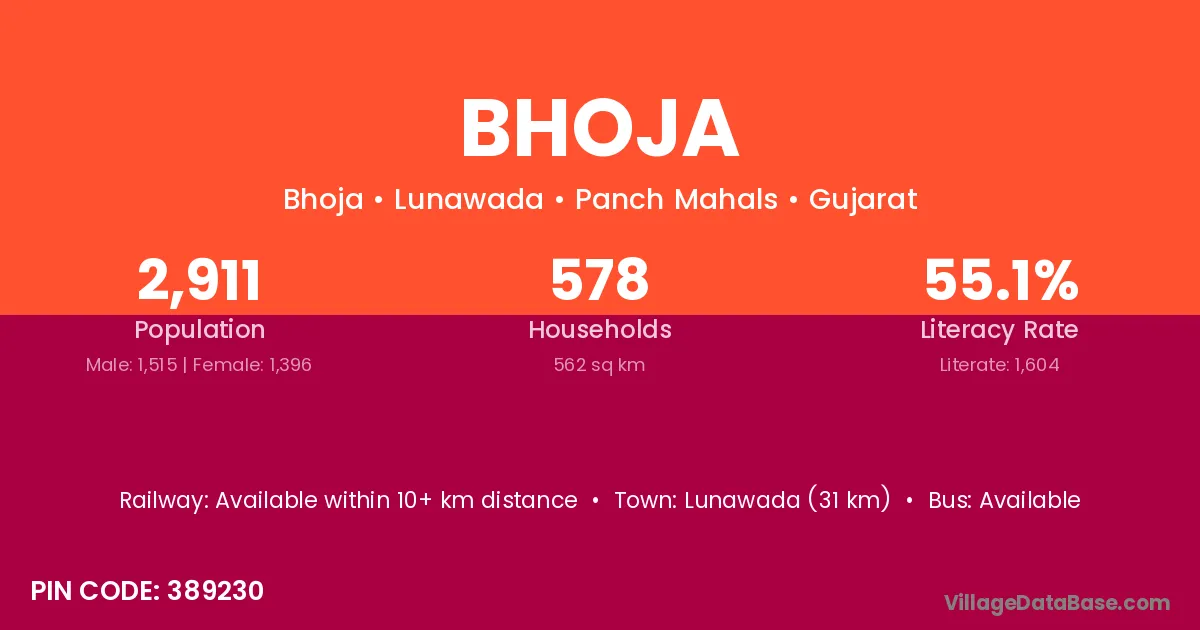 The literacy rate of Bhoja village is 45.52%. Male literacy stands at 52.37% and female literacy at 37.47%.
