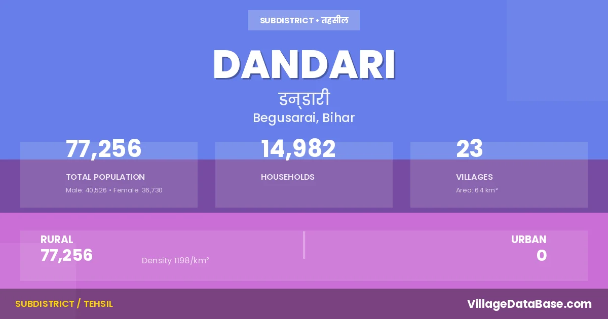 Dandari is a town and Subdivision in the Begusarai district of the Bihar. In India, a Subdivision is a subdivision of a district responsible for the administration and revenue collection of a specific area within the district. Subdivisions play a crucial role in the local governance structure, contributing significantly to the development and administration of their communities.