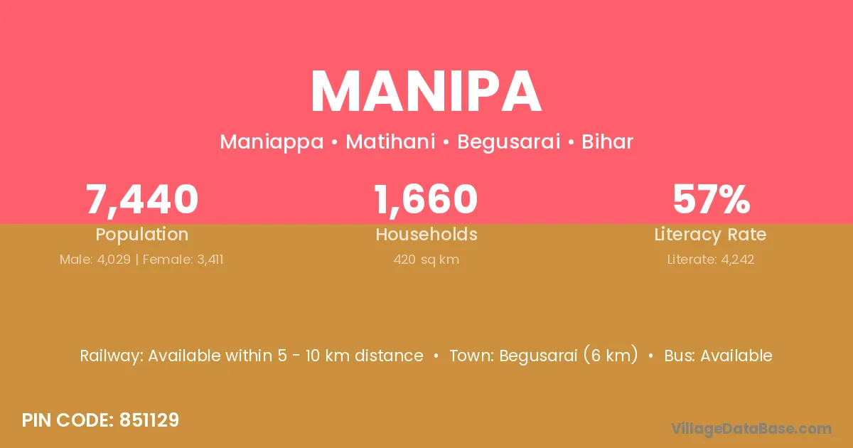 Begusarai (6 km) is the nearest town to Manipa village for major economic activities and is located approximately 6 km away.