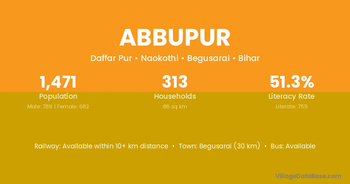 Begusarai (30 km) is the nearest town to Abbupur village for major economic activities and is located approximately 30 km away.