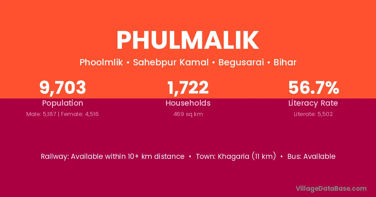 Khagaria (11 km) is the nearest town to Phulmalik village for major economic activities and is located approximately 11 km away.