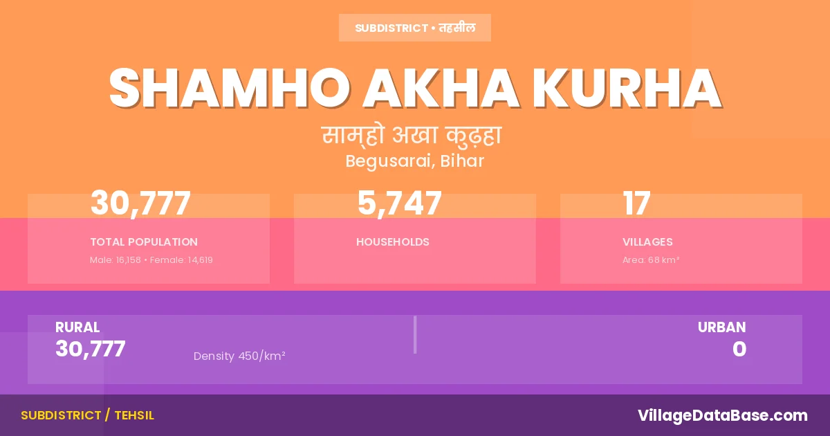 Shamho Akha Kurha is a town and Subdivision in the Begusarai district of the Bihar. In India, a Subdivision is a subdivision of a district responsible for the administration and revenue collection of a specific area within the district. Subdivisions play a crucial role in the local governance structure, contributing significantly to the development and administration of their communities.