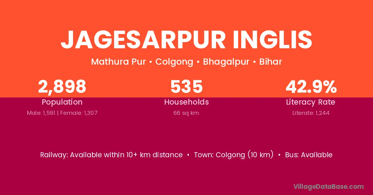 Colgong (10 km) is the nearest town to Jagesarpur Inglis village for major economic activities and is located approximately 10 km away.