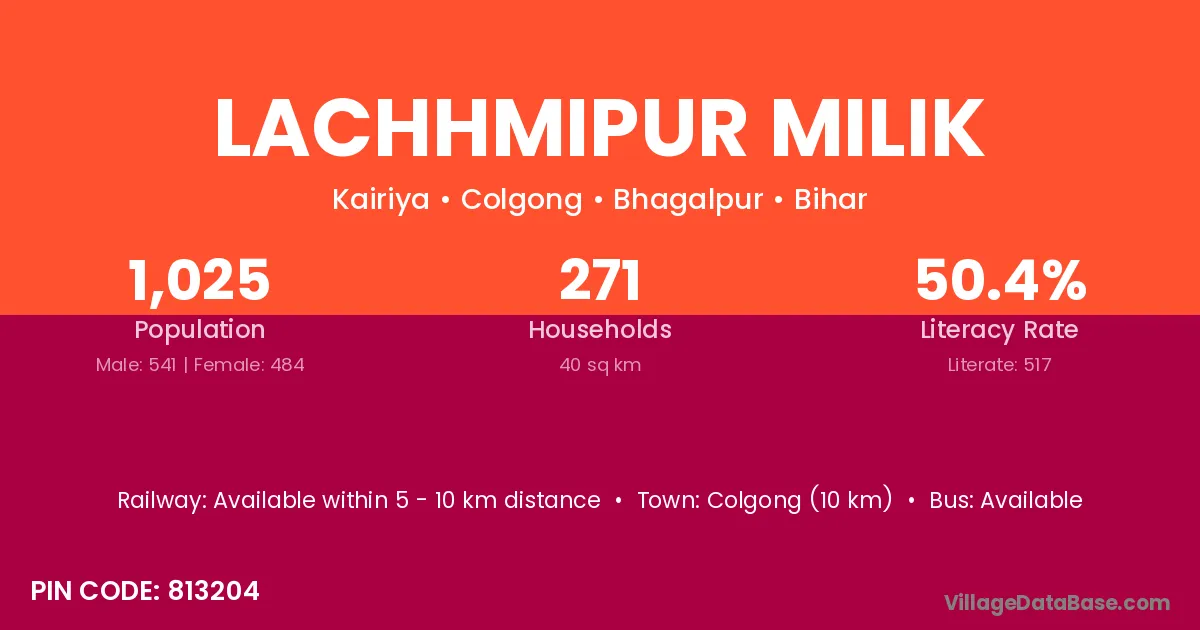 Colgong (10 km) is the nearest town to Lachhmipur Milik village for major economic activities and is located approximately 10 km away.