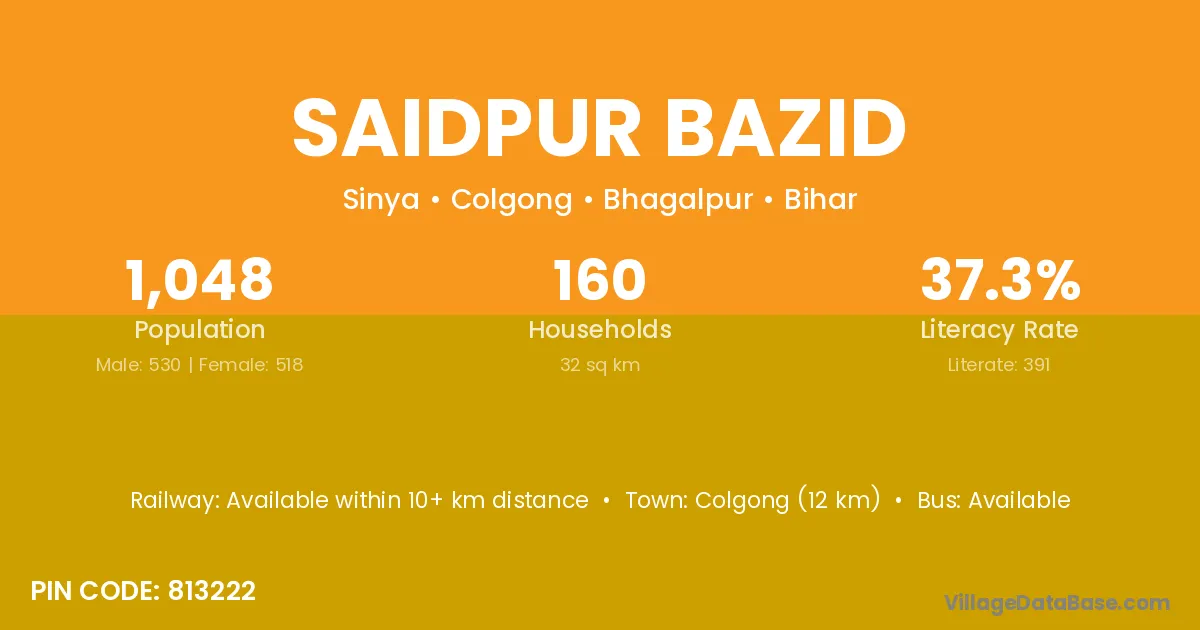 Colgong (12 km) is the nearest town to Saidpur Bazid village for major economic activities and is located approximately 12 km away.