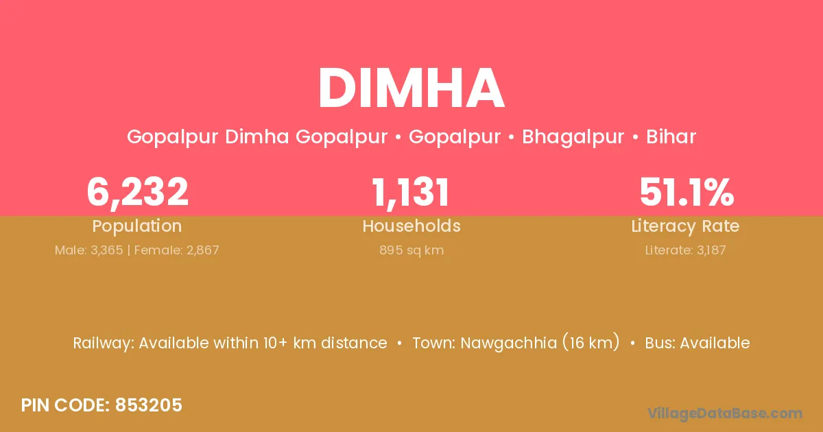 Nawgachhia (16 km) is the nearest town to Dimha village for major economic activities and is located approximately 16 km away.