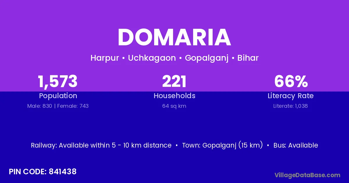 The literacy rate of Domaria village is 46.02%. Male literacy stands at 53.60% and female literacy at 37.60%.