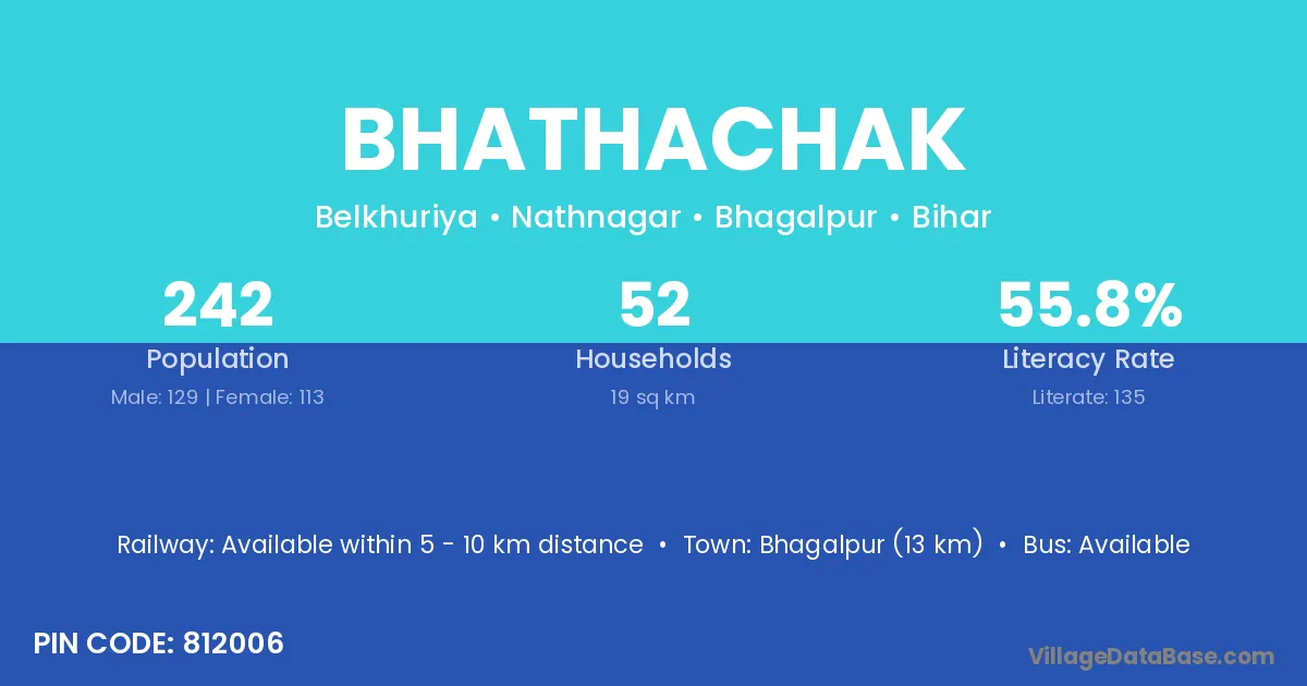 Bhagalpur (13 km) is the nearest town to Bhathachak village for major economic activities and is located approximately 13 km away.