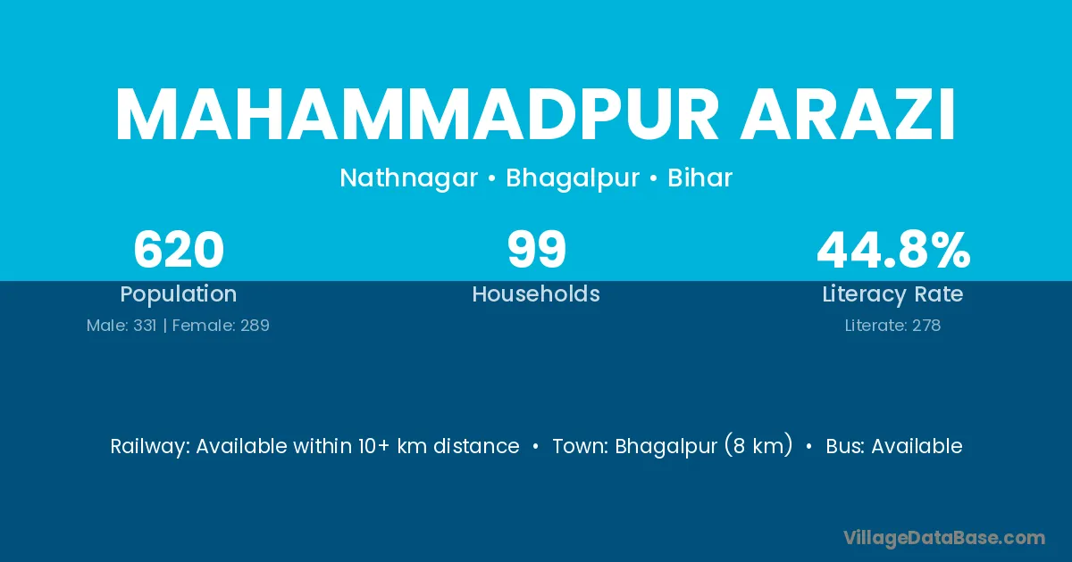 Bhagalpur (8 km) is the nearest town to Mahammadpur Arazi village for major economic activities and is located approximately 8 km away.